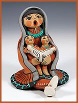 ![]() Story teller dolls or figurines are a popular type of Pueblo dolls made from clay, representing an open-mouthed woman (or sometimes a man) singing and telling stories to children. They symbolize family, tradition, and happiness. |